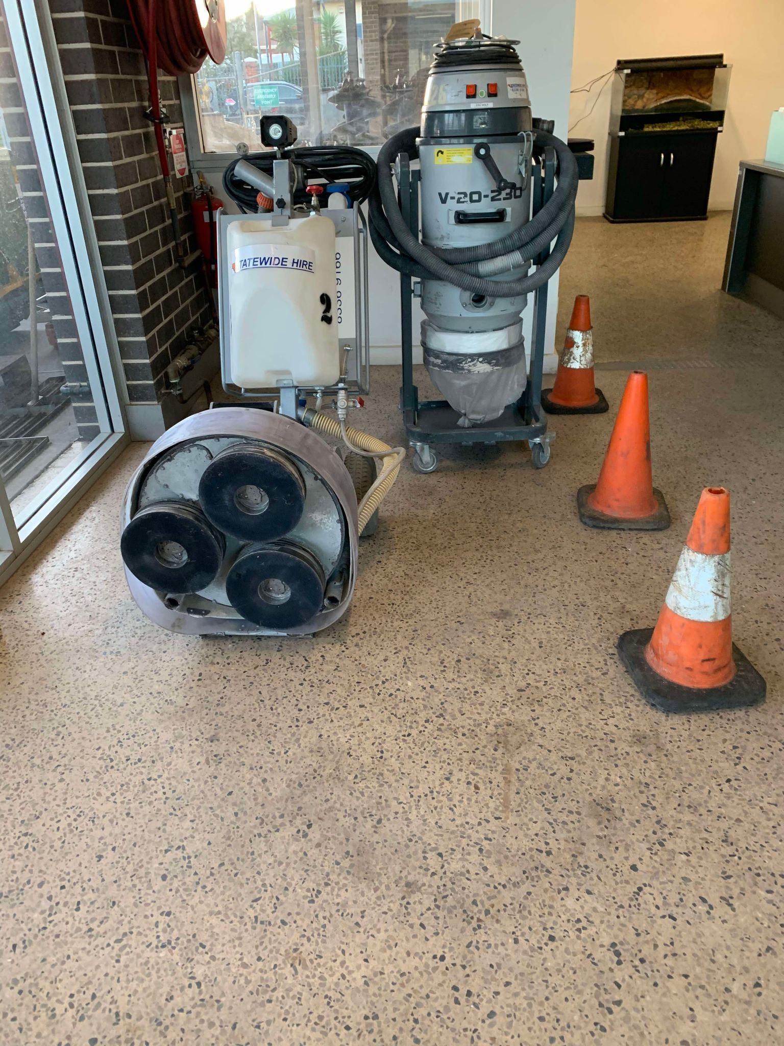 This 9-inch concrete grinder comes with a diamond disk on a stand. Vacuum cleaner is also included in the hire rate.
